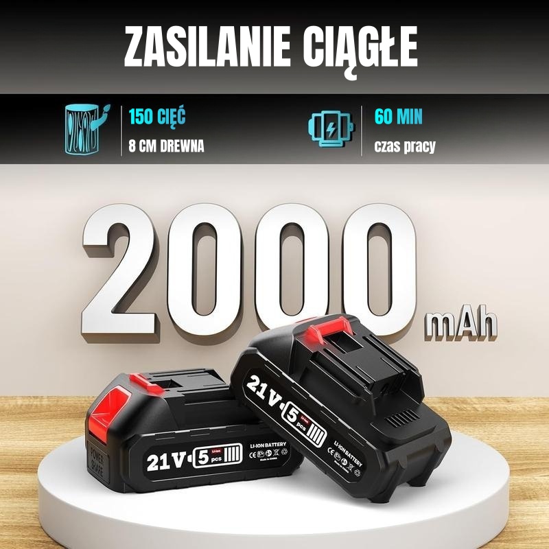 🔋 Podwójna Moc Akumulatora: 2× akumulatory 21V/4000mAh = 100 minut ciągłego cięcia (test: 8-calowy pień w 12 sekund!)