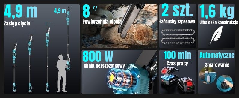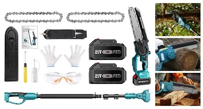 8" pilarka teleskopowa + 6" mini piła łańcuchowa z teleskopowym wysięgnikiem, 800 W, 4x akumulator 21V 2000mAh, ładowarka, prowadnice (2 szt.), łańcuchy (4 szt.), zestaw narzędzi, 2-letnia gwarancja