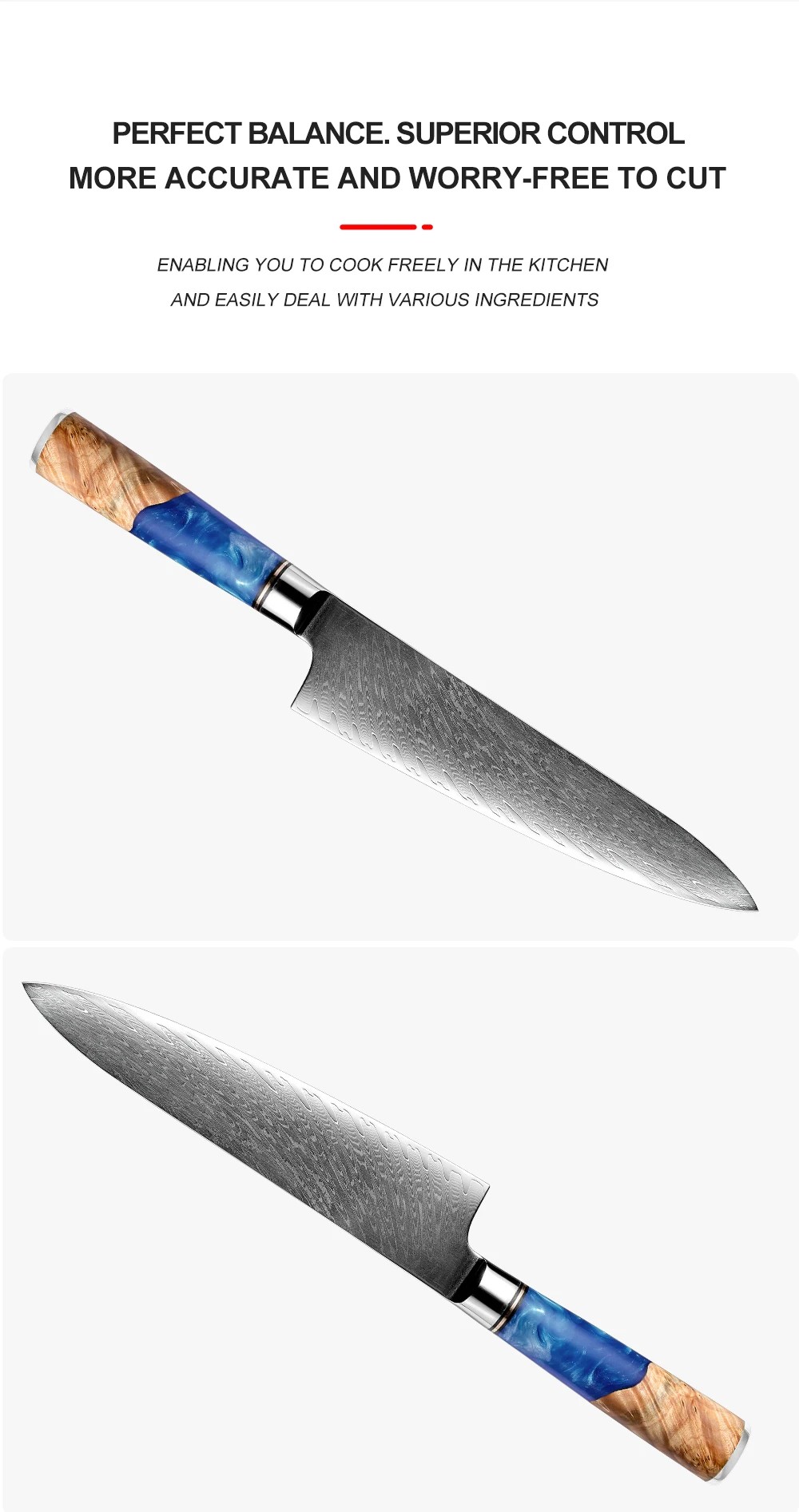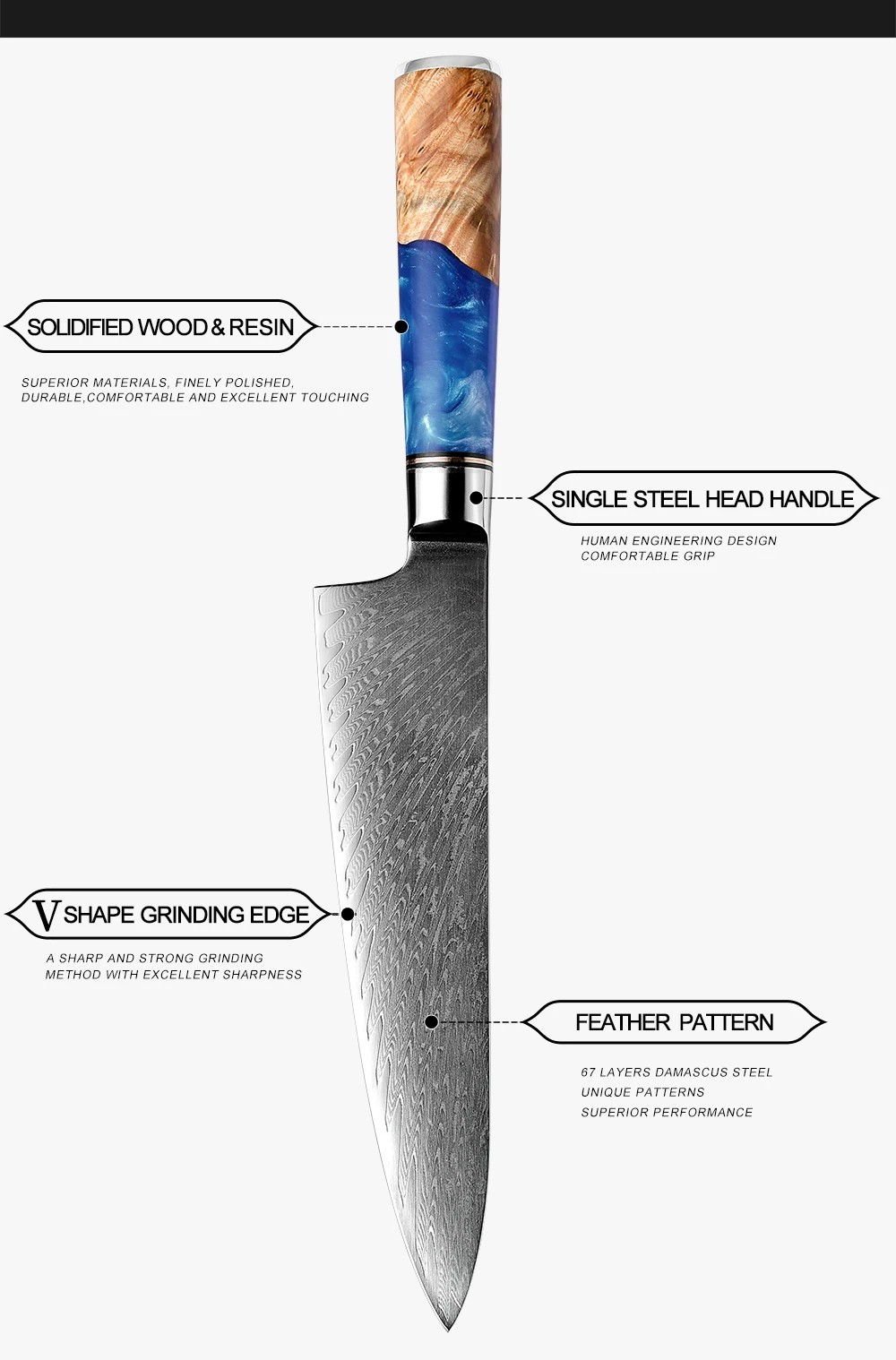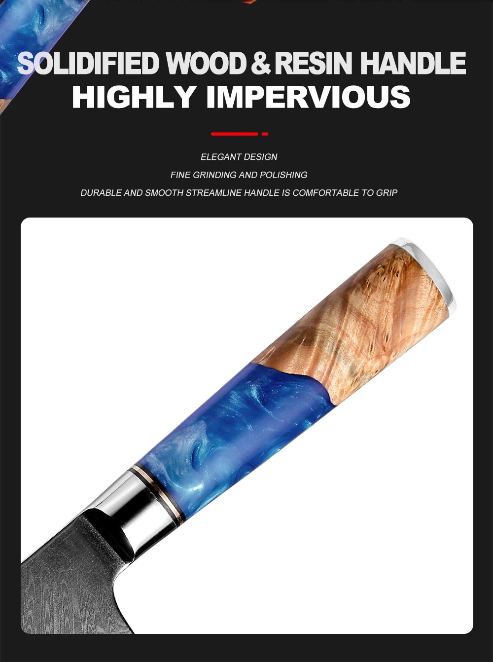Rękojeść wykonana jest z niebieskiej żywicy i utwardzonego drewna. Dzięki specjalnemu procesowi produkcji, połączenie żywicy i drewna sprawia, że każda rękojeść ma unikalny wygląd.
